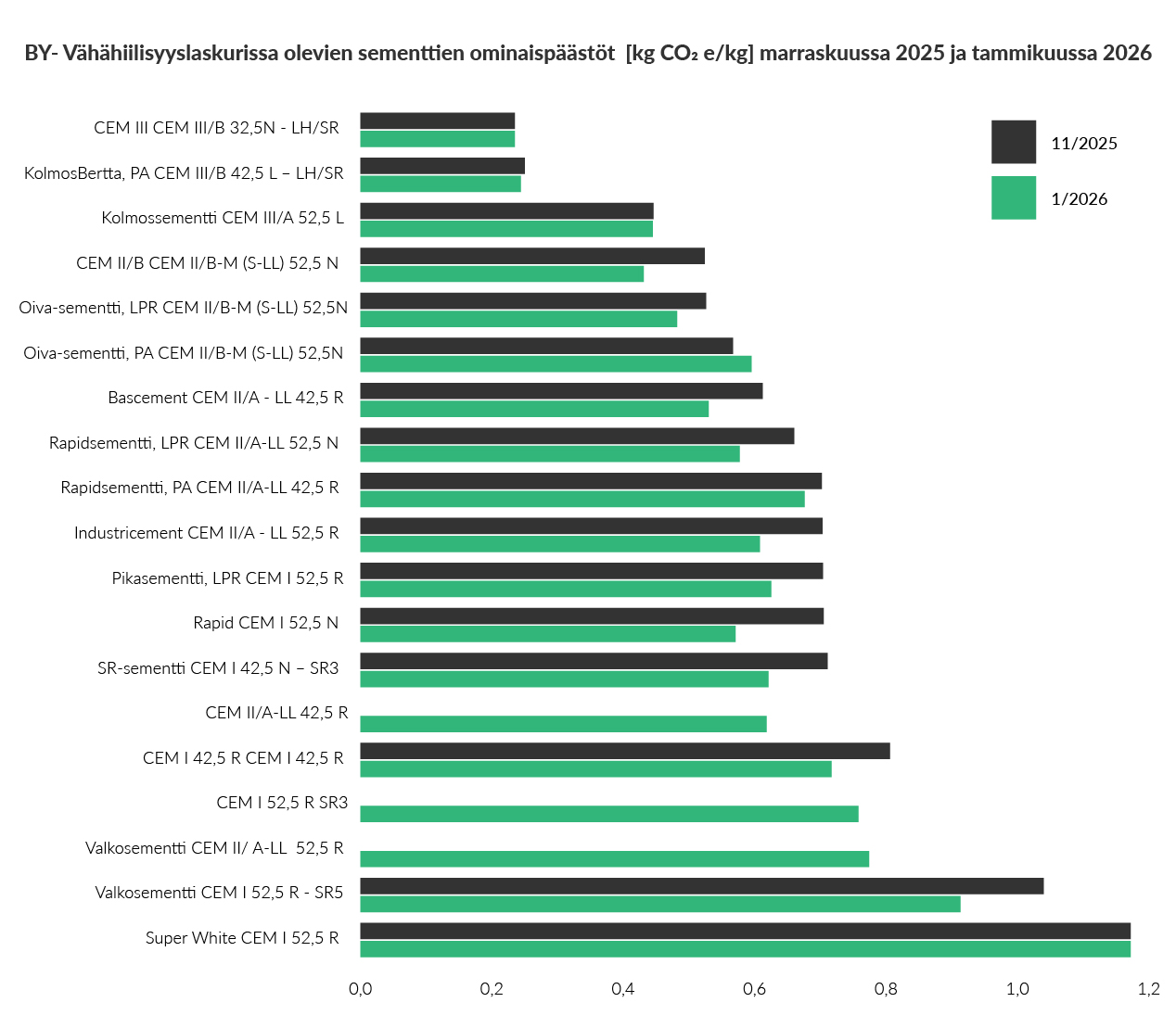 BY-Vähähiilisyysluokitus® siirtyi käyttämään GWPtotal.net-arvoa 1.1.2026 alkaen. Oheisesta kuvasta näkyvät eri sementtien ominaisarvojen muutokset.